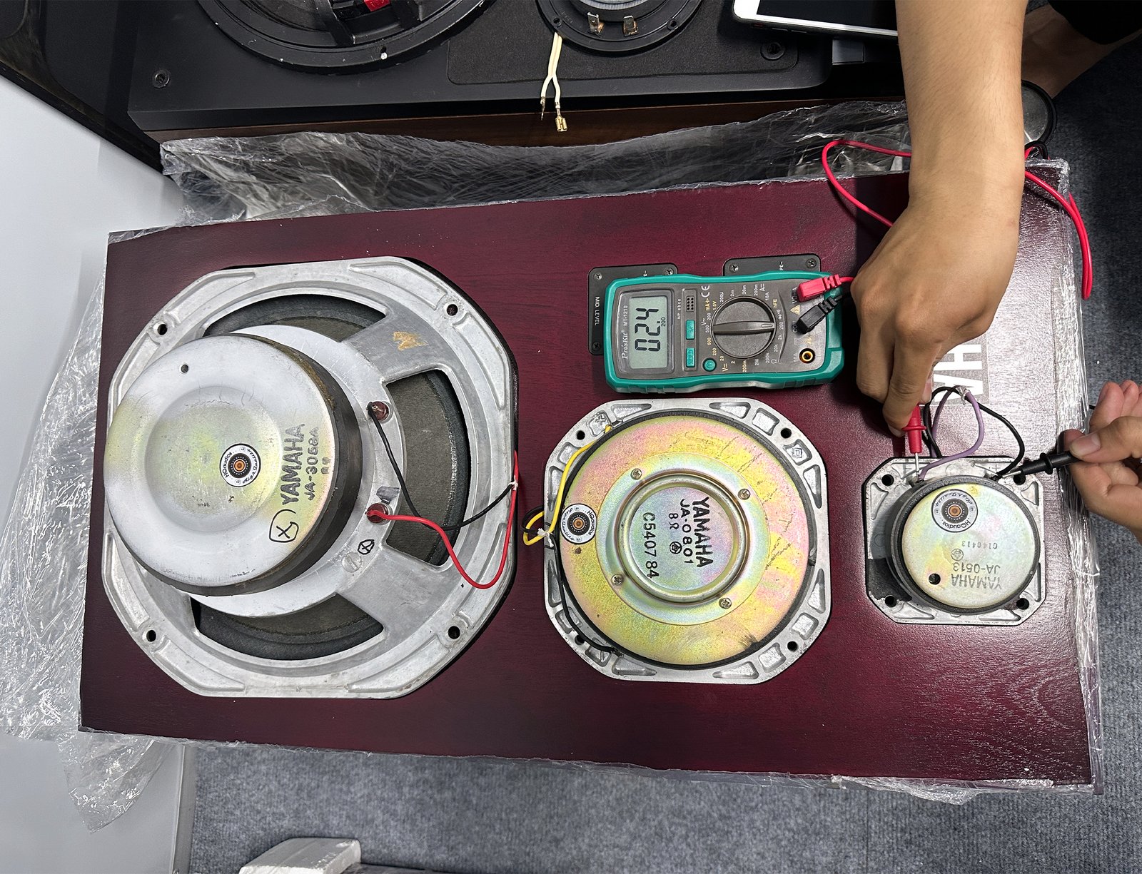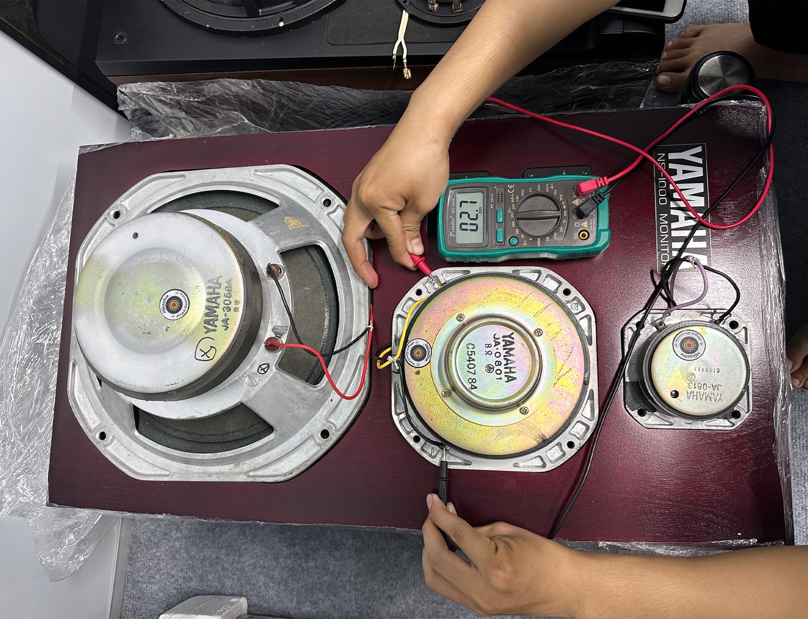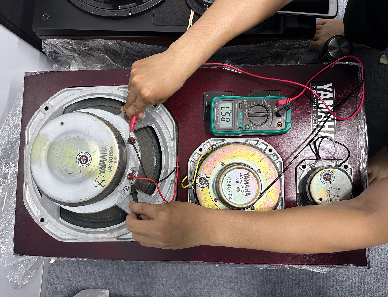 • All drivers (woofer, beryllium midrange, beryllium tweeter) were removed, cleaned, and tested with precision equipment.