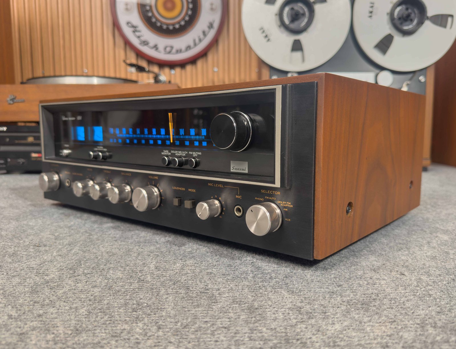 - Classic Sansui layout – silver face with black accents and wood casing