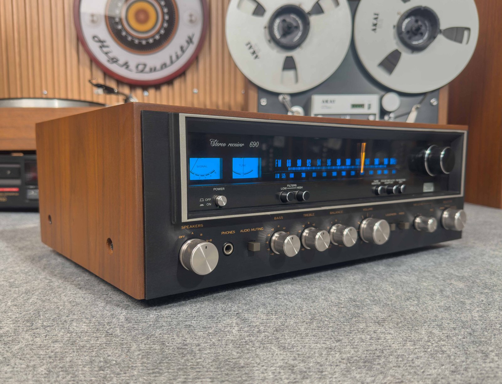 After servicing, the receiver was tested on our bench and performed excellently, delivering a powerful, warm, distortion-free signal characteristic of analog receivers. All inputs, outputs, and features were confirmed operational, and the tuner spins smoothly. Additional testing was conducted, and we can provide specific feature information upon request. This is a remarkable find for the vintage audiophile.