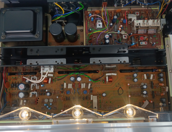 Upon inspection, the unit had scratchy controls, a dim dial, and some distortion in one channel. Therefore, it underwent servicing by our technician. Pioneer used certain transistors in this model that are known to fail after 40 years, so all of these were replaced. This upgrade resolved the distortion issue. Additionally, several questionable capacitors were replaced.